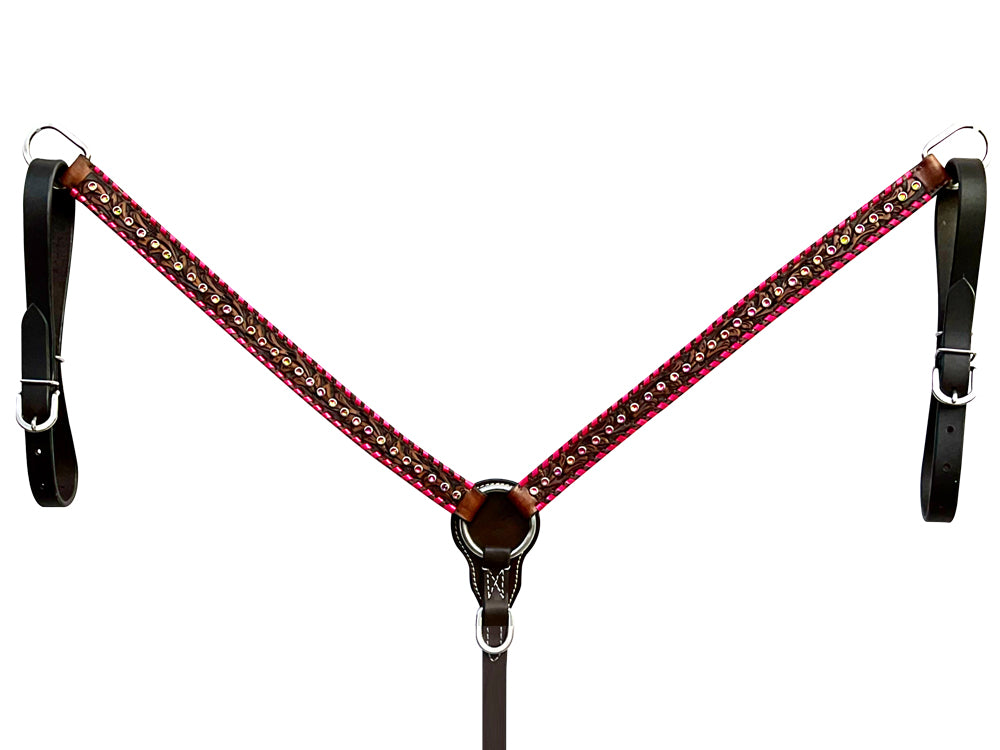 Bar H Equine Horse Genuine Leather Buckstitch Stud Breast Collar ,Headstall Brown